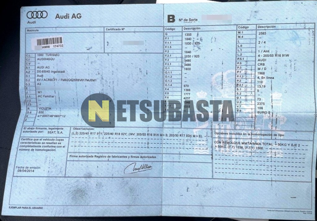 Subasta de Audi A3 2.0 TDI 2014 Siniestrados, Marca Audi, Modelo A3 2.0 TDI, Combustible Diésel, Kilometraje 172.000 KM, Fecha 1ª matriculación 04/2014, Matrícula ****HWW, Color Exterior , Color Interior , IVA REBU y Ubicación Badajoz.