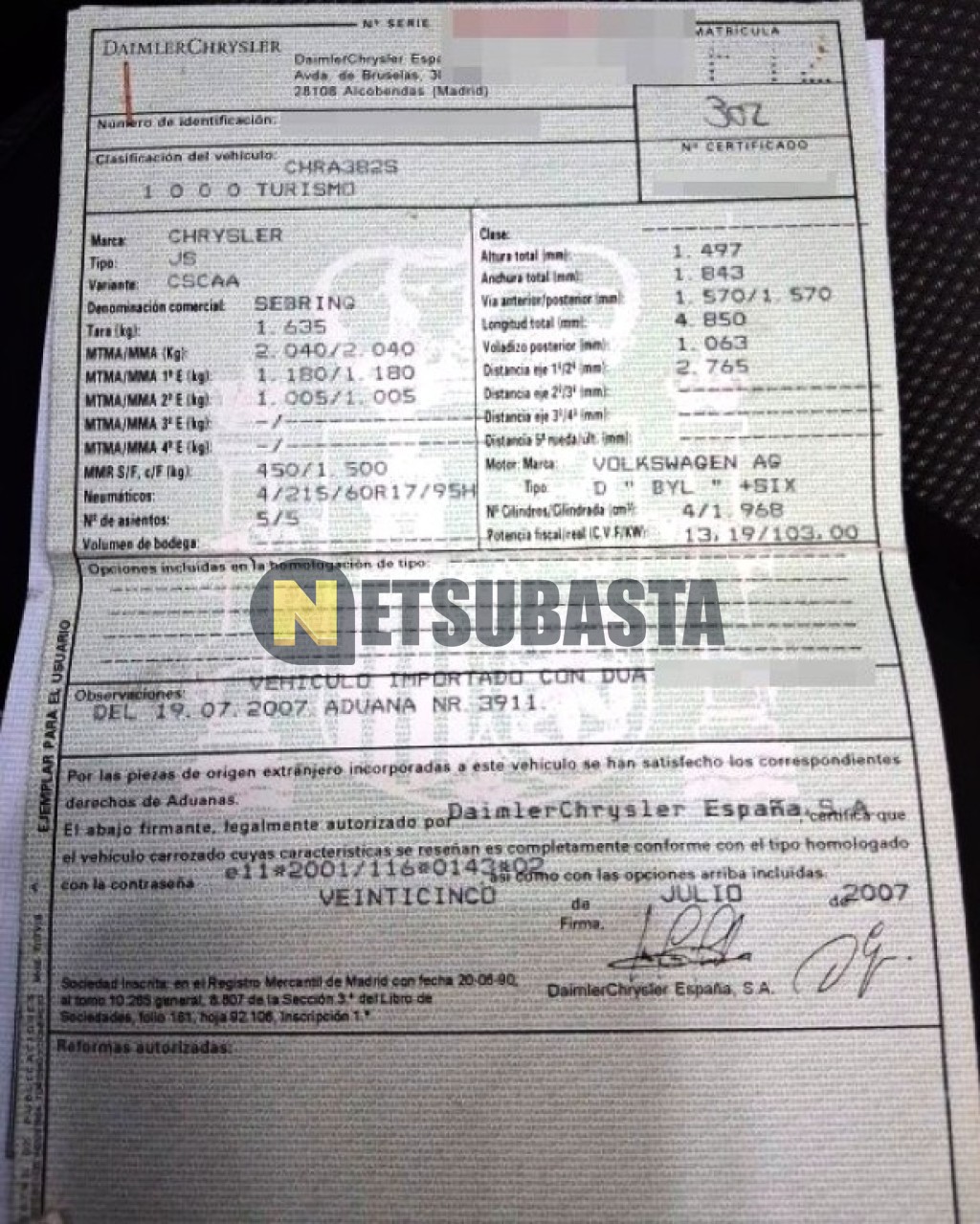Subasta de Chrysler Sebring 200 C Sedan 2.0 CRD 2007 Averiados, Marca Chrysler, Modelo Sebring 200 C Sedan 2.0 CRD, Combustible Diésel, Kilometraje 266.000 KM, Fecha 1ª matriculación 08/2007, Matrícula ****FTZ, Color Exterior , Color Interior , IVA REBU y Ubicación Granada.