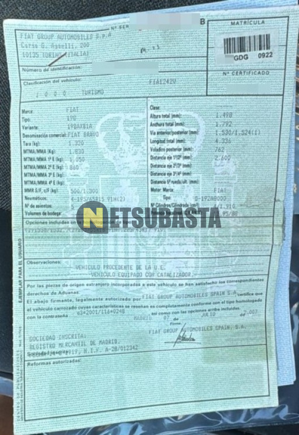 Subasta de Fiat Bravo 1.9 Multijet 2008 Siniestrados, Marca Fiat, Modelo Bravo 1.9 Multijet, Combustible Diésel, Kilometraje DESCONOCIDO , Fecha 1ª matriculación 04/2008, Matrícula ****GDG, Color Exterior , Color Interior , IVA REBU y Ubicación Tarragona.