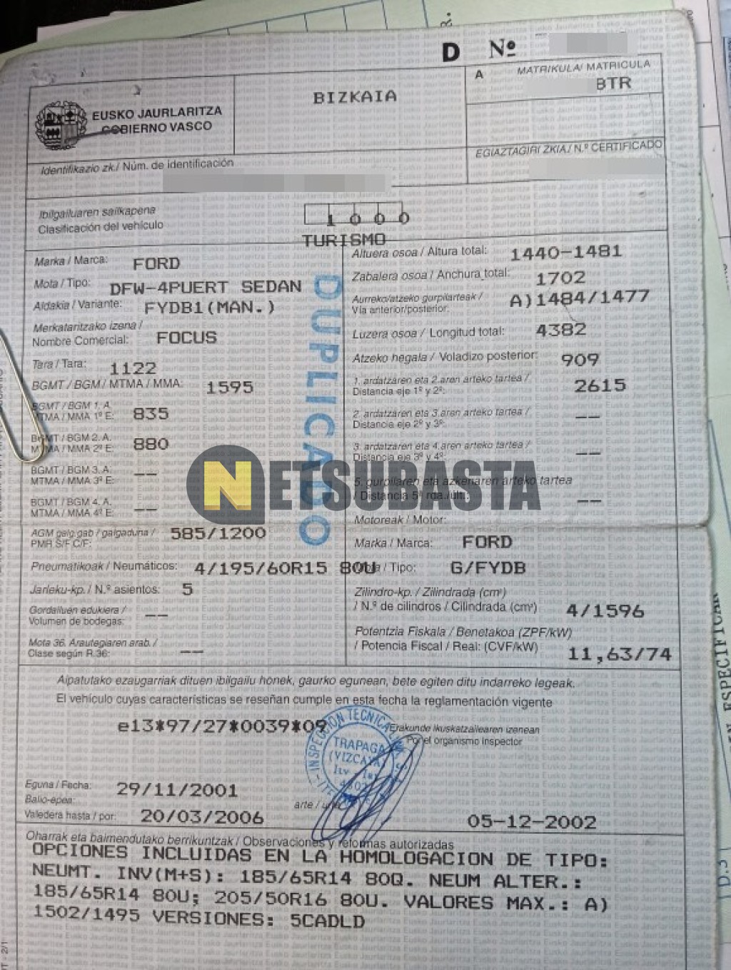 Subasta de Ford Focus 1.6 2002 Averiados, Marca Ford, Modelo Focus 1.6 , Combustible Gasolina, Kilometraje 197.000 KM, Fecha 1ª matriculación 03/2002, Matrícula ****BTR, Color Exterior , Color Interior , IVA REBU y Ubicación Vizcaya.