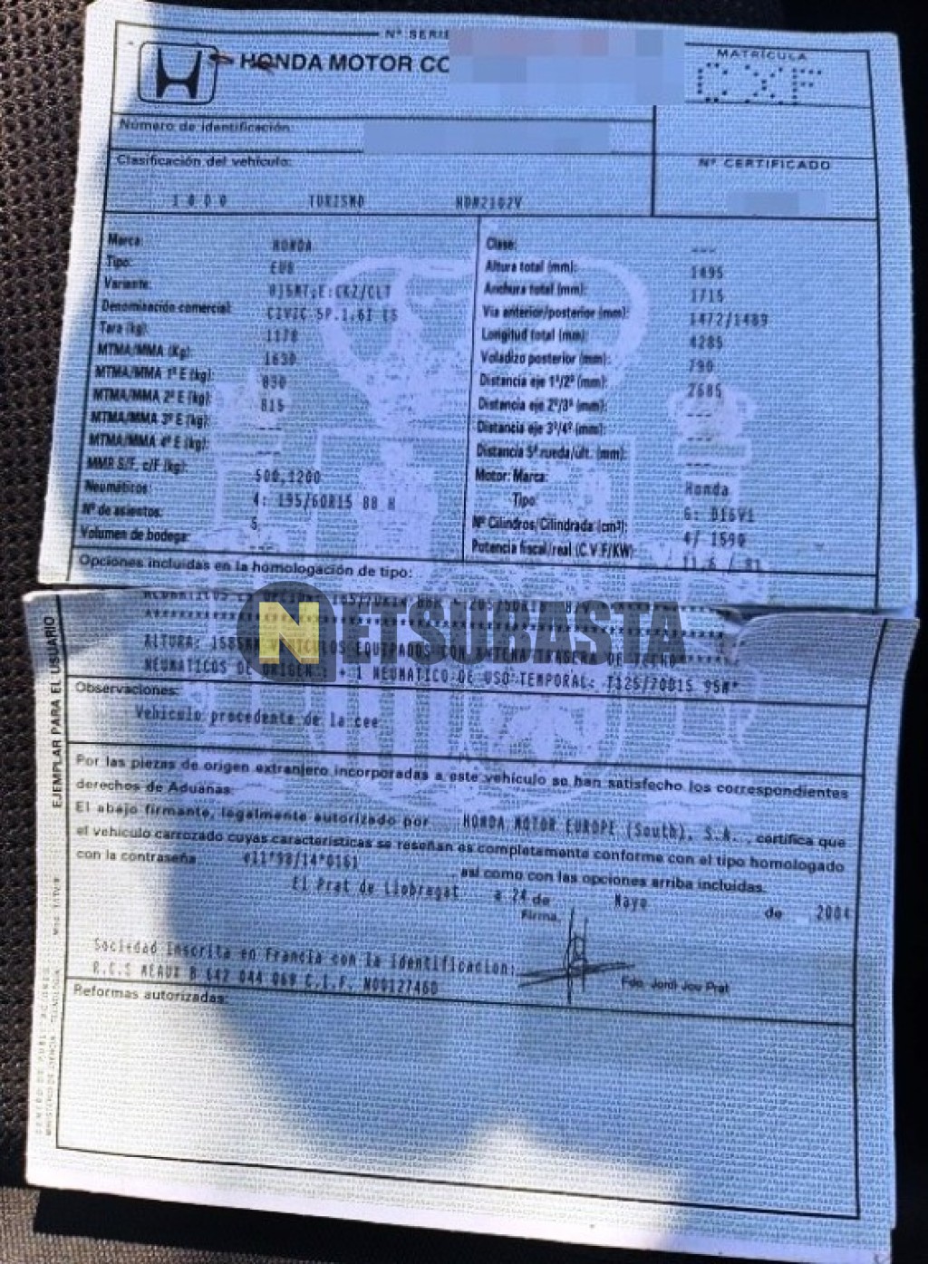 Subasta de Honda Civic 1.6 VTEC 2004 Siniestrados, Marca Honda, Modelo Civic 1.6 VTEC , Combustible Gasolina, Kilometraje 205.000 KM, Fecha 1ª matriculación 06/2004, Matrícula ****CXF, Color Exterior , Color Interior , IVA REBU y Ubicación Valencia.
