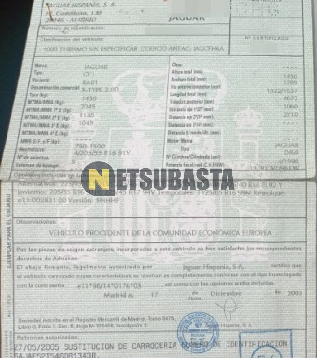 Subasta de Jaguar X-Type 2.0D 2004 Siniestrados, Marca Jaguar, Modelo X-Type 2.0D, Combustible Diésel, Kilometraje 180.000 KM, Fecha 1ª matriculación 01/2004, Matrícula ****CRG, Color Exterior , Color Interior , IVA REBU y Ubicación Burgos.