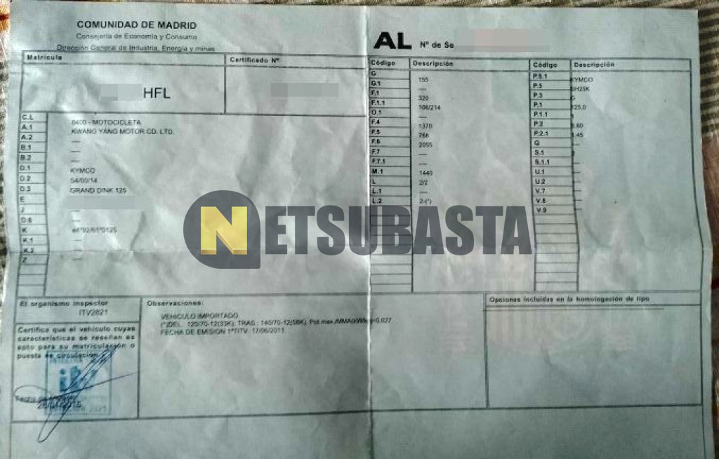 Subasta de Kymco Grand Dink 125 2011 Averiados, Marca Kymco, Modelo Grand Dink 125, Combustible Gasolina, Kilometraje 68.000 KM, Fecha 1ª matriculación 07/2011, Matrícula ****HFL, Color Exterior , Color Interior , IVA REBU y Ubicación Madrid.
