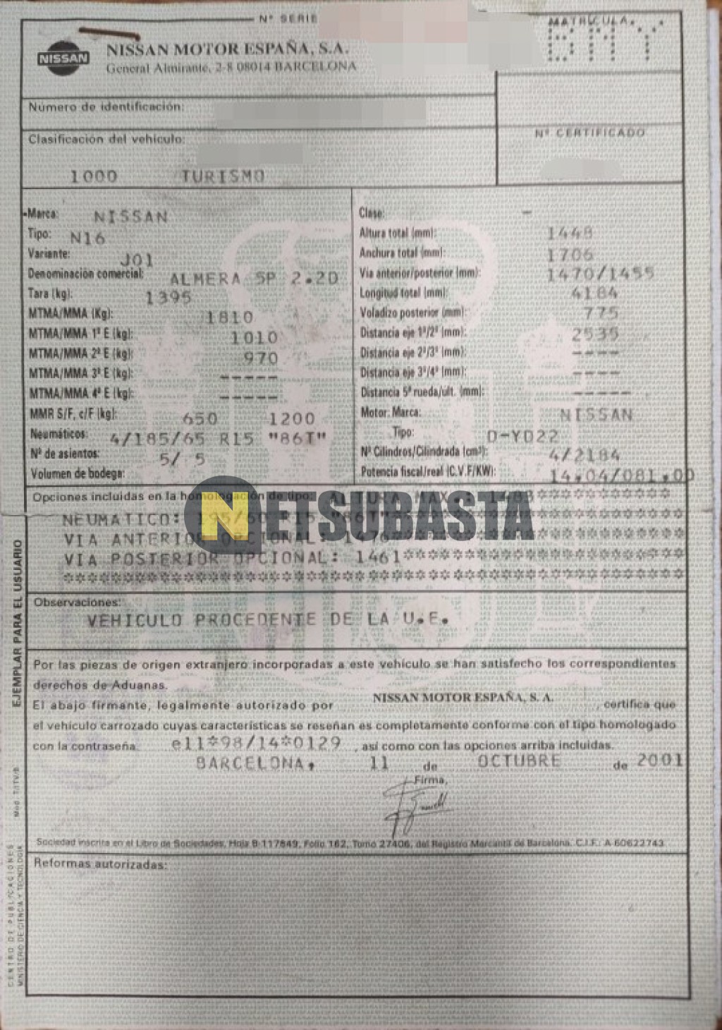 Subasta de Nissan Almera 2.2Di 2001 Averiados, Marca Nissan, Modelo Almera 2.2Di, Combustible Diésel, Kilometraje 200.000 KM, Fecha 1ª matriculación 10/2001, Matrícula ****BNY, Color Exterior , Color Interior , IVA REBU y Ubicación Madrid.