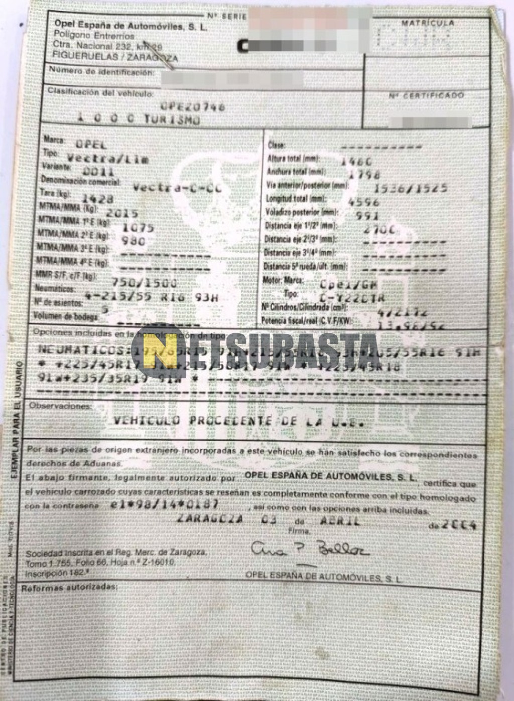 Subasta de Opel Vectra 2.2 DTi 2004 Averiados, Marca Opel, Modelo Vectra 2.2 DTi, Combustible Diésel, Kilometraje 307.000 KM, Fecha 1ª matriculación 06/2004, Matrícula ****CWR, Color Exterior , Color Interior , IVA REBU y Ubicación Valencia.