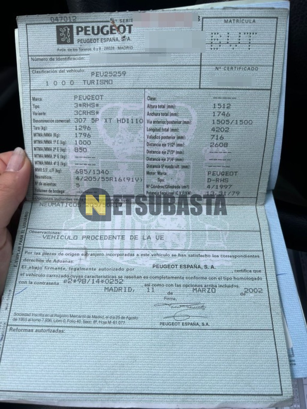 Subasta de Peugeot 307 2.0 HDi 2002 Averiados, Marca Peugeot, Modelo 307 2.0 HDi, Combustible Diésel, Kilometraje 240.000 KM, Fecha 1ª matriculación 04/2002, Matrícula ****BVT, Color Exterior , Color Interior , IVA REBU y Ubicación Valladolid.