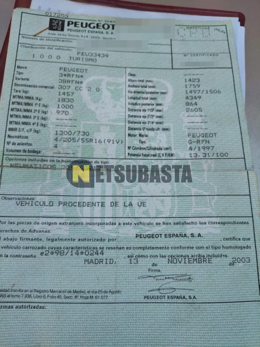 Subasta de Peugeot 307 CC 2.0 16v 2003 Averiados, Marca Peugeot, Modelo 307 CC 2.0 16v, Combustible Gasolina, Kilometraje 208.000 KM, Fecha 1ª matriculación 11/2003, Matrícula ****CPD, Color Exterior , Color Interior , IVA REBU y Ubicación Gerona.
