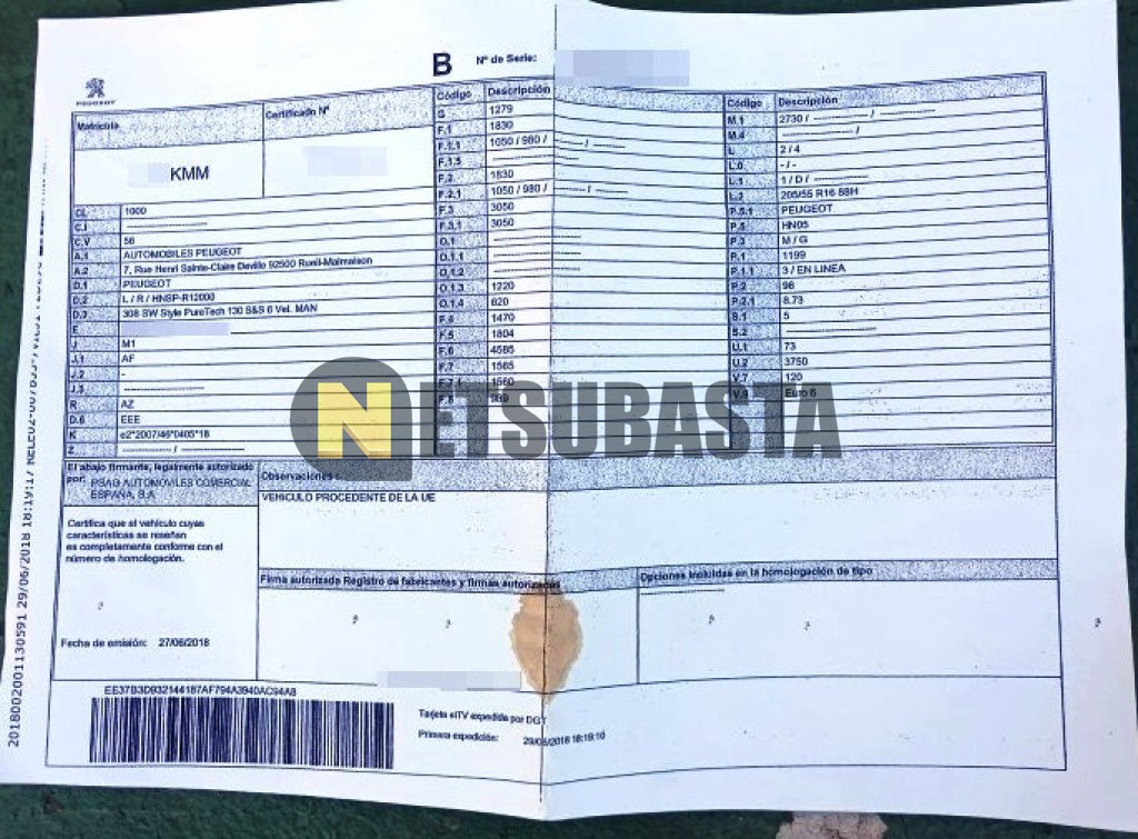 Subasta de Peugeot 308 SW 1.2 PureTech 2018 Averiados, Marca Peugeot, Modelo 308 SW 1.2 PureTech, Combustible Gasolina, Kilometraje 100.000 KM, Fecha 1ª matriculación 06/2018, Matrícula ****KMM, Color Exterior , Color Interior , IVA REBU y Ubicación Valencia.