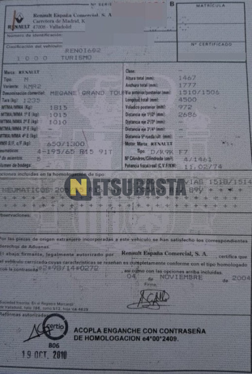 Subasta de Renault Megane Grand Tour 1.5 dCi 2004 Averiados, Marca Renault, Modelo Megane Grand Tour 1.5 dCi, Combustible Diésel, Kilometraje 265.000 KM, Fecha 1ª matriculación 11/2004, Matrícula ****DCS, Color Exterior , Color Interior , IVA REBU y Ubicación Barcelona.