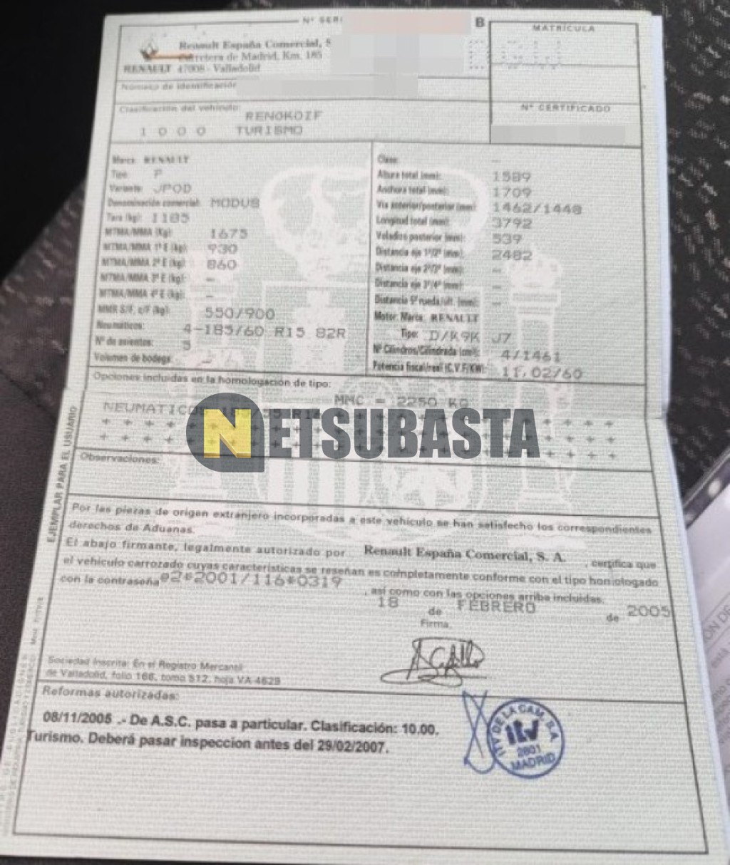 Subasta de Renault Modus 1.5 dCi 2005 Averiados, Marca Renault, Modelo Modus 1.5 dCi, Combustible Diésel, Kilometraje 255.000 KM, Fecha 1ª matriculación 02/2005, Matrícula ****DGW, Color Exterior , Color Interior , IVA REBU y Ubicación Burgos.