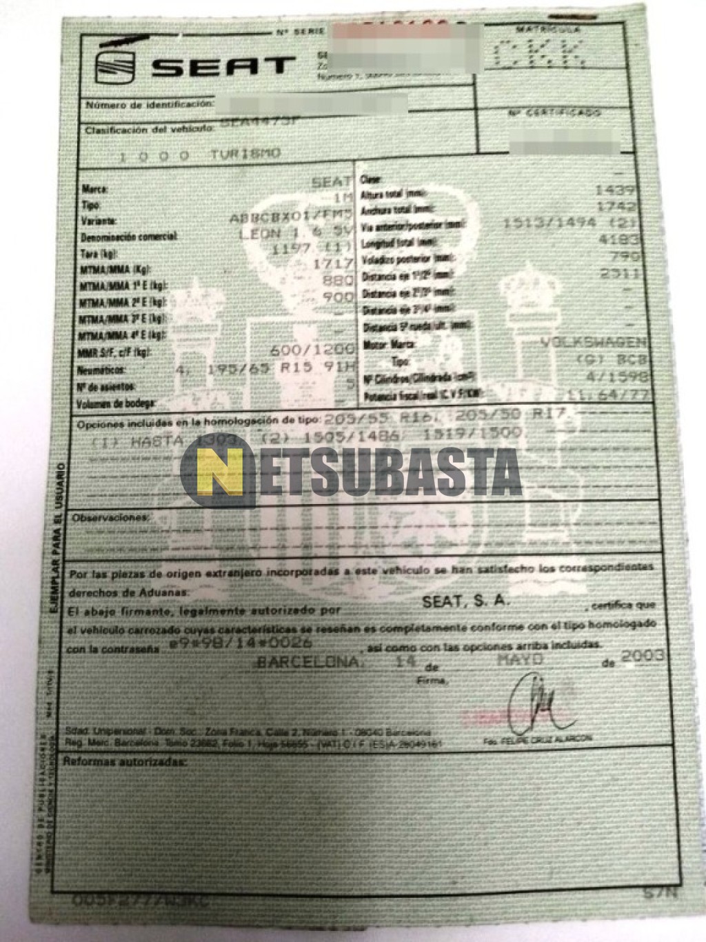 Subasta de Seat Leon 1.6 2003 Averiados, Marca Seat, Modelo Leon 1.6, Combustible Gasolina, Kilometraje 80.000 KM, Fecha 1ª matriculación 07/2003, Matrícula ****CKK, Color Exterior , Color Interior , IVA REBU y Ubicación Sevilla.