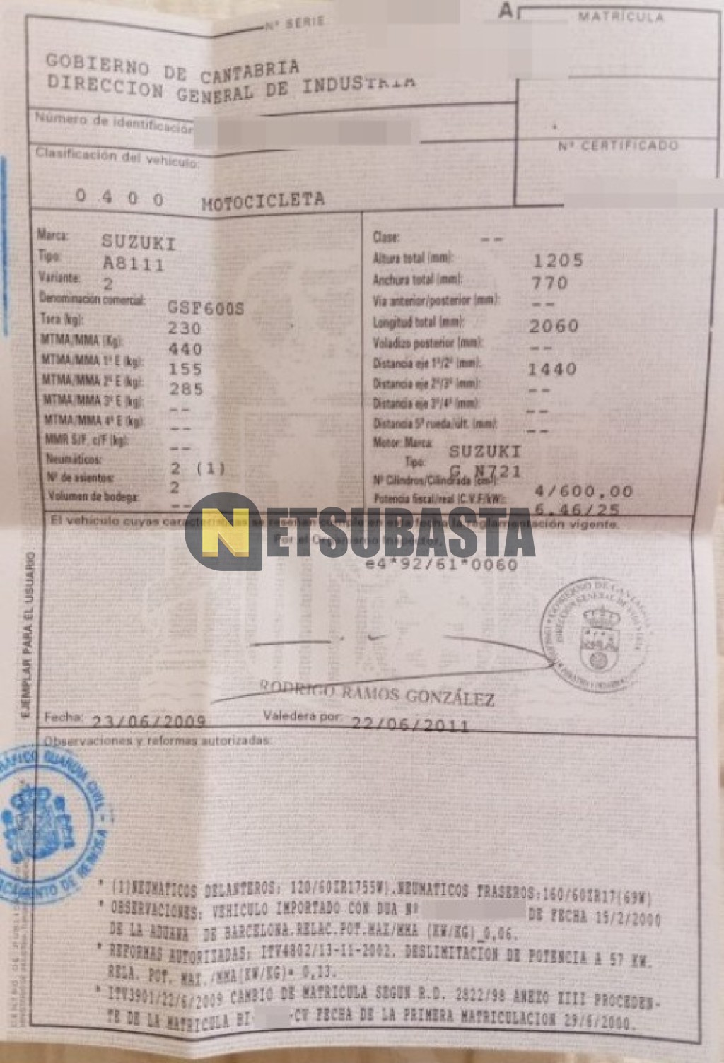 Subasta de Suzuki GSF 600 Bandit 2000 Averiados, Marca Suzuki, Modelo GSF 600 Bandit, Combustible Gasolina, Kilometraje 37.000 KM, Fecha 1ª matriculación 06/2000, Matrícula ****GNB, Color Exterior , Color Interior , IVA REBU y Ubicación Cantabria.