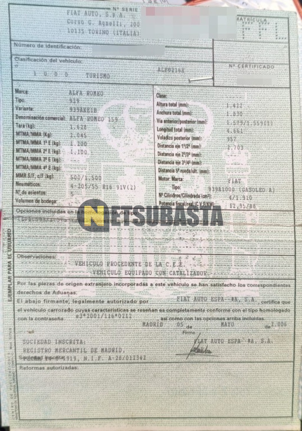 Subasta de Alfa Romeo 159 1.9 JTD 2006 Averiados, Marca Alfa Romeo, Modelo 159 1.9 JTD, Combustible Diésel, Kilometraje 308.000 KM, Fecha 1ª matriculación 09/2006, Matrícula ****FFL, Color Exterior , Color Interior , IVA REBU y Ubicación Zaragoza.