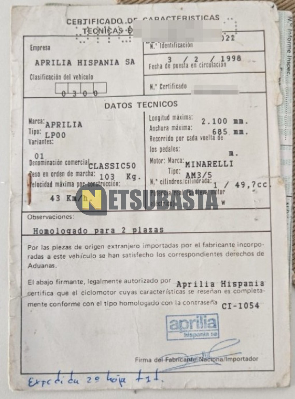 Subasta de Aprilia Classic 50 2002 Averiados, Marca Aprilia, Modelo Classic 50, Combustible Gasolina, Kilometraje 20.000 KM, Fecha 1ª matriculación 08/2002, Matrícula C****BNG, Color Exterior , Color Interior , IVA REBU y Ubicación Murcia.