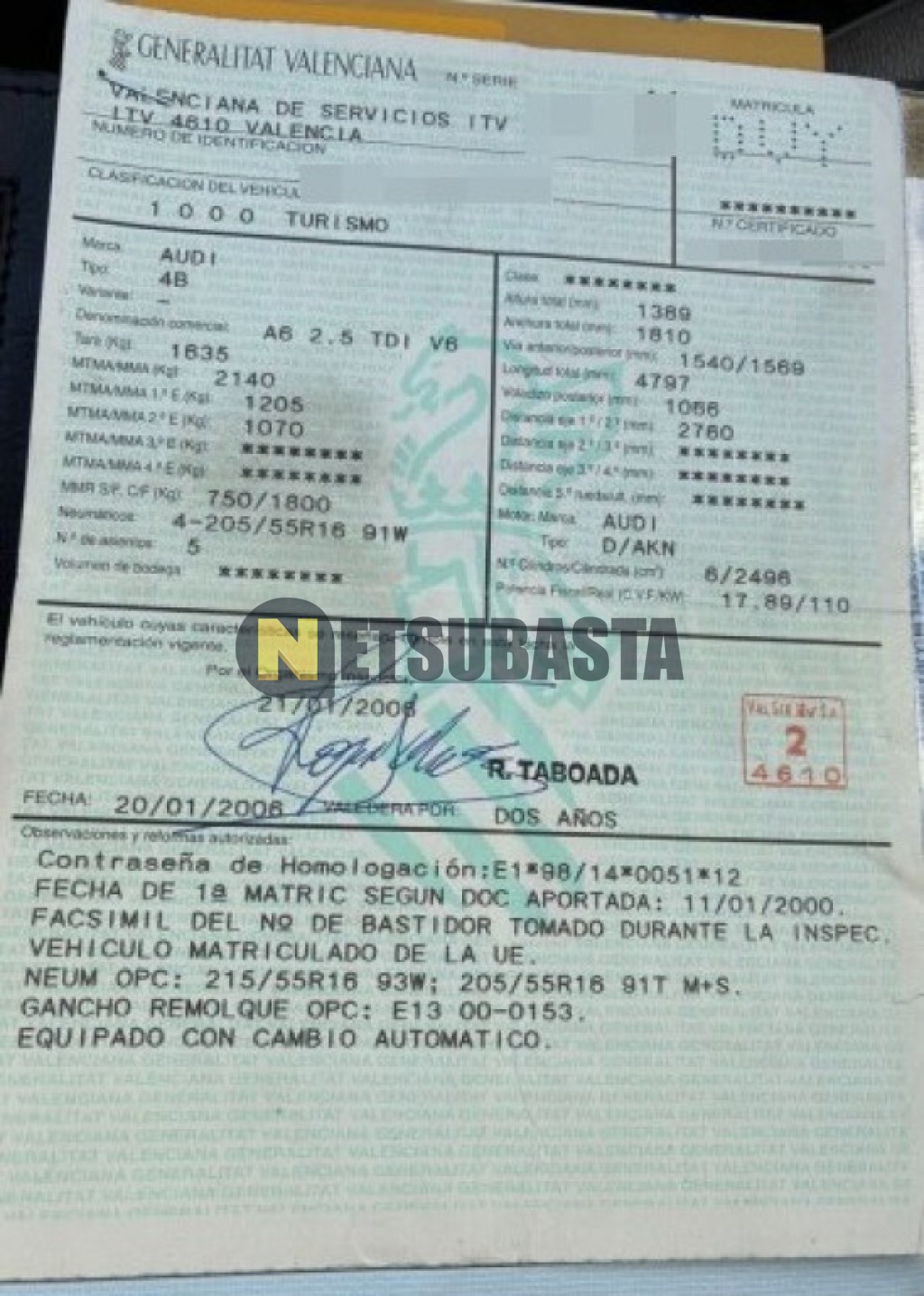 Subasta de Audi A6 2.5 TDI tiptronic 5 vel. 2000 Averiados, Marca Audi, Modelo A6 2.5 TDI tiptronic 5 vel., Combustible Diésel, Kilometraje 330.000 KM, Fecha 1ª matriculación 01/2000, Matrícula ****DVY, Color Exterior , Color Interior , IVA REBU y Ubicación Valencia.