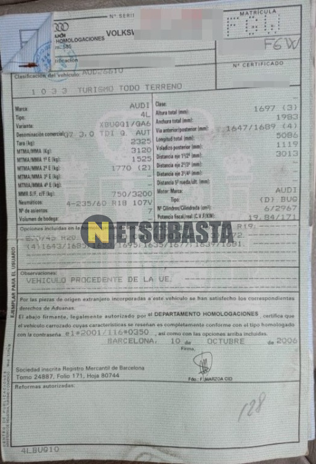Subasta de Audi Q7 3.0 TDI quattro tiptronic 6 vel. 2006 Averiados, Marca Audi, Modelo Q7 3.0 TDI quattro tiptronic 6 vel., Combustible Diésel, Kilometraje 325.000 KM, Fecha 1ª matriculación 10/2006, Matrícula ****FGW, Color Exterior , Color Interior , IVA REBU y Ubicación La Coruña.