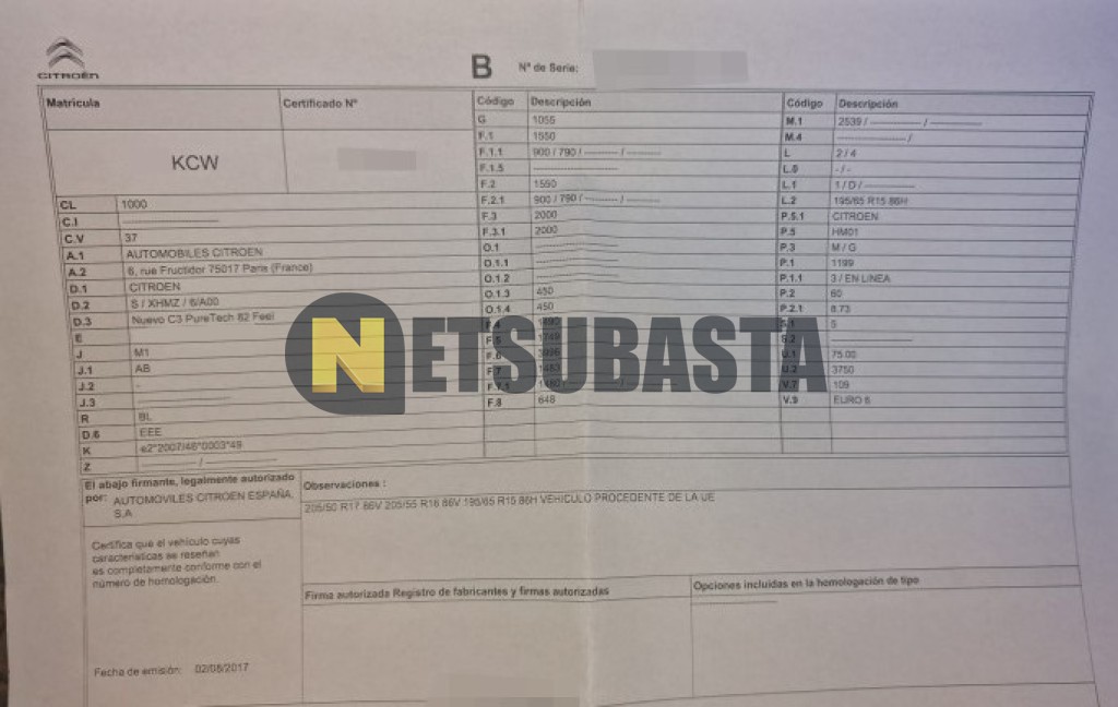 Subasta de Citroën C3 1.2 PureTech 2017 Averiados, Marca Citroën, Modelo C3 1.2 PureTech, Combustible Gasolina, Kilometraje 211.000 KM, Fecha 1ª matriculación 09/2017, Matrícula ****KCW, Color Exterior , Color Interior , IVA REBU y Ubicación Santa Cruz de Tenerife.