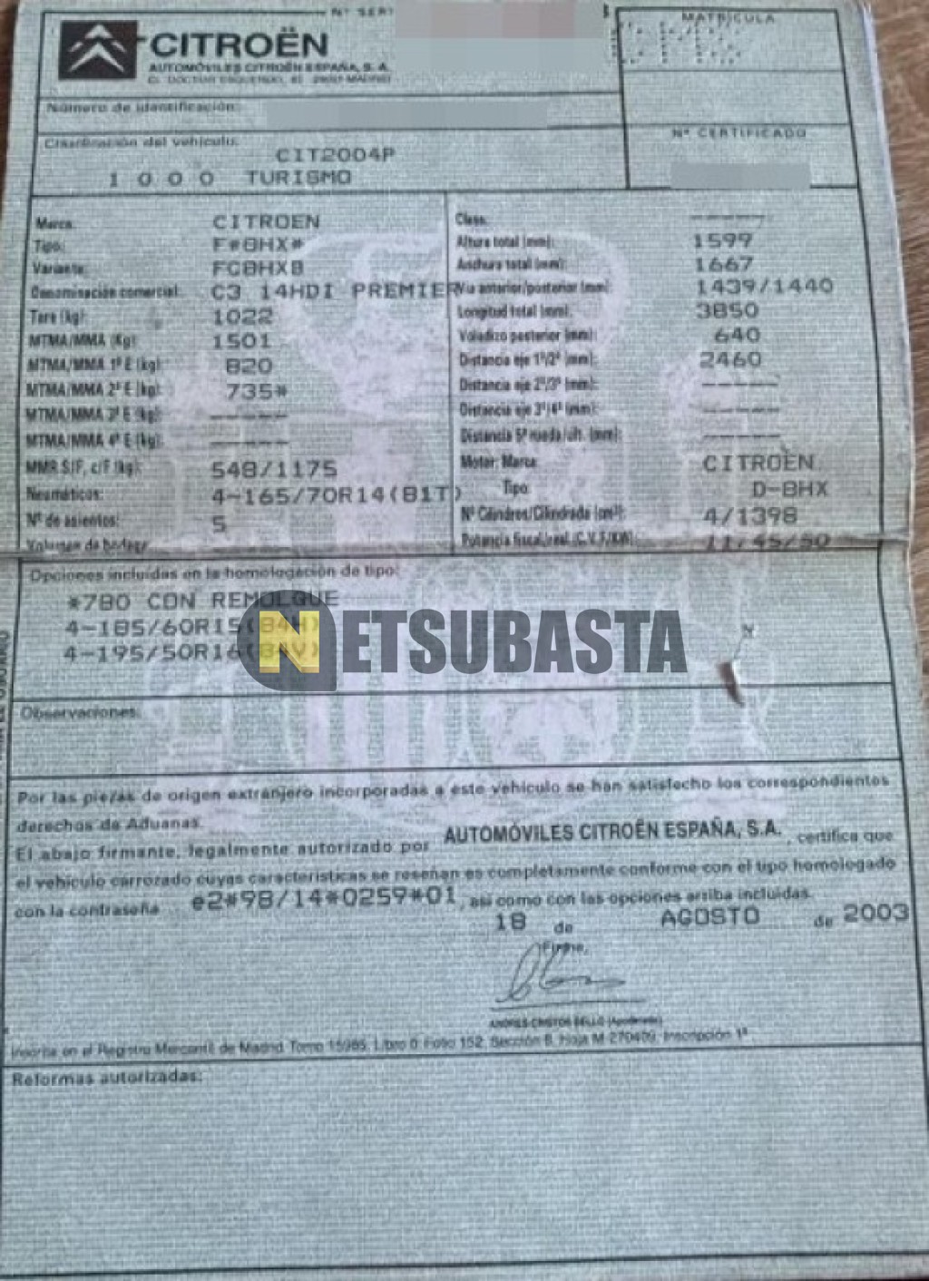 Subasta de Citroën C3 1.4 HDi 2003 Averiados, Marca Citroën, Modelo C3 1.4 HDi, Combustible Diésel, Kilometraje 319.000 KM, Fecha 1ª matriculación 10/2003, Matrícula ****CMS, Color Exterior , Color Interior , IVA REBU y Ubicación Alicante.