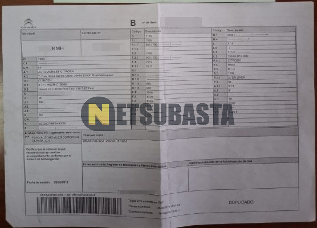 Subasta de Citroën C4 Cactus 1.2 PureTech 2018 Averiados, Marca Citroën, Modelo C4 Cactus 1.2 PureTech, Combustible Gasolina, Kilometraje 177.000 KM, Fecha 1ª matriculación 06/2018, Matrícula ****KMH, Color Exterior , Color Interior , IVA REBU y Ubicación Madrid.