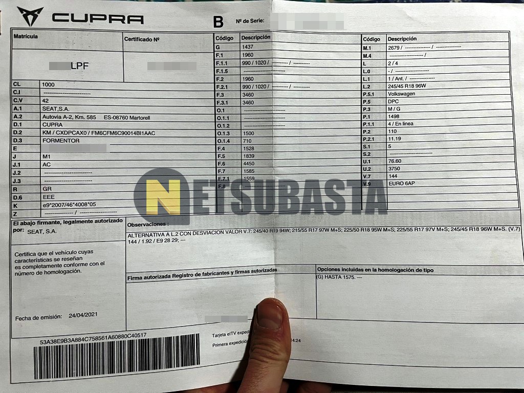 Subasta de Cupra Formentor 1.5 TSI 2021 Siniestrados, Marca Cupra, Modelo Formentor 1.5 TSI, Combustible Gasolina, Kilometraje 75.000 KM, Fecha 1ª matriculación 05/2021, Matrícula ****LPF, Color Exterior , Color Interior , IVA REBU y Ubicación Valencia.
