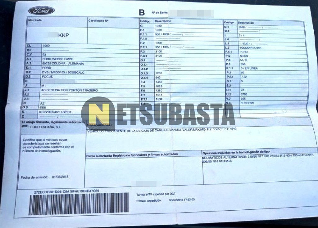 Subasta de Ford Focus 1.0 EcoBoost 2018 Averiados, Marca Ford, Modelo Focus 1.0 EcoBoost, Combustible Gasolina, Kilometraje 115.000 KM, Fecha 1ª matriculación 04/2018, Matrícula ****KKP, Color Exterior , Color Interior , IVA REBU y Ubicación Barcelona.