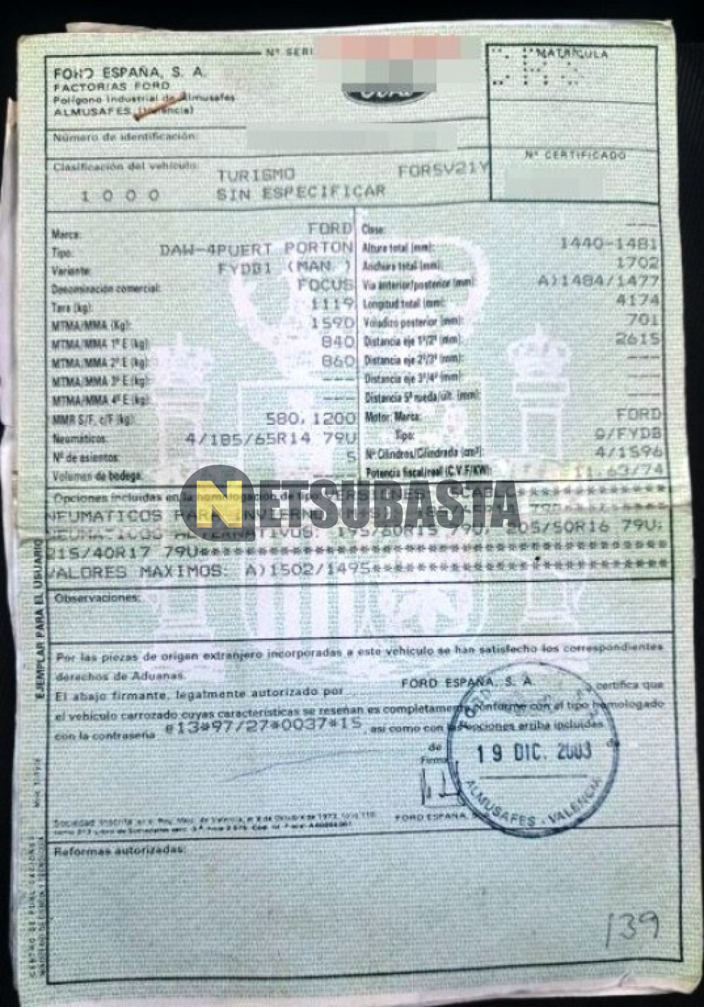 Subasta de Ford Focus 1.6 2004 Averiados, Marca Ford, Modelo Focus 1.6, Combustible Gasolina, Kilometraje 275.000 KM, Fecha 1ª matriculación 01/2004, Matrícula ****CRS, Color Exterior , Color Interior , IVA REBU y Ubicación Murcia.