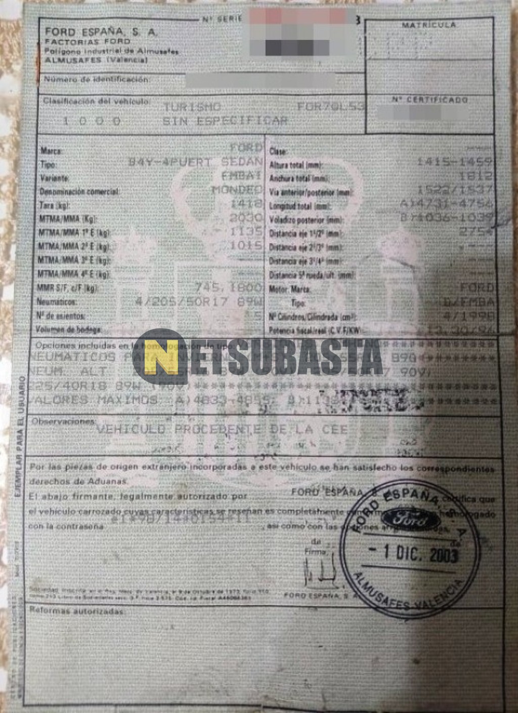 Subasta de Ford Mondeo 2.0 TDCi 2003 Averiados, Marca Ford, Modelo Mondeo 2.0 TDCi, Combustible Diésel, Kilometraje 420.000 KM, Fecha 1ª matriculación 12/2003, Matrícula ****CPP, Color Exterior , Color Interior , IVA REBU y Ubicación Málaga.