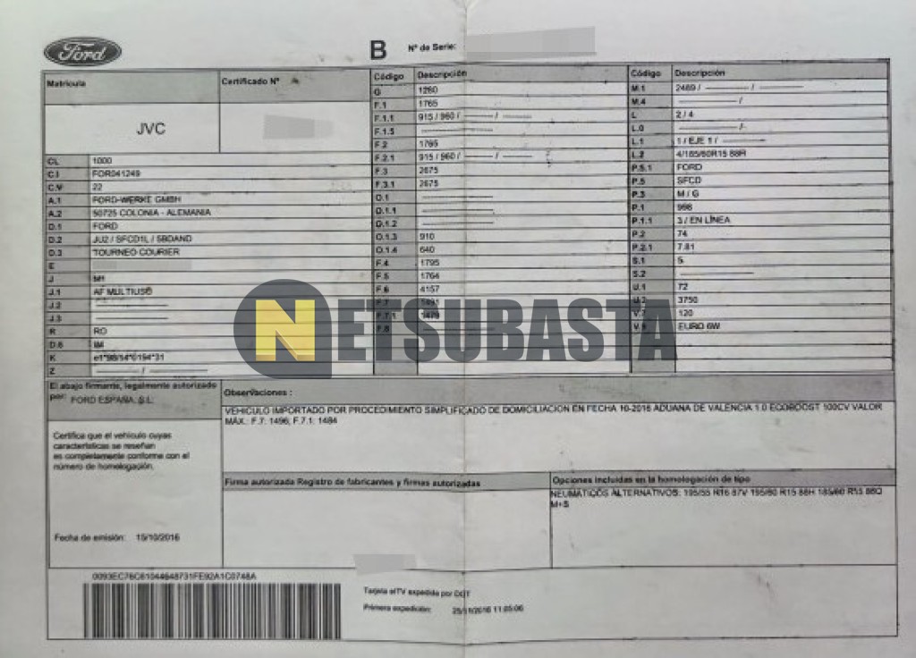 Subasta de Ford Tourneo Courier 1.0 EcoBoost 2016 Averiados, Marca Ford, Modelo Tourneo Courier 1.0 EcoBoost, Combustible Gasolina, Kilometraje 180.000 KM, Fecha 1ª matriculación 11/2016, Matrícula ****JVC, Color Exterior , Color Interior , IVA REBU y Ubicación Barcelona.