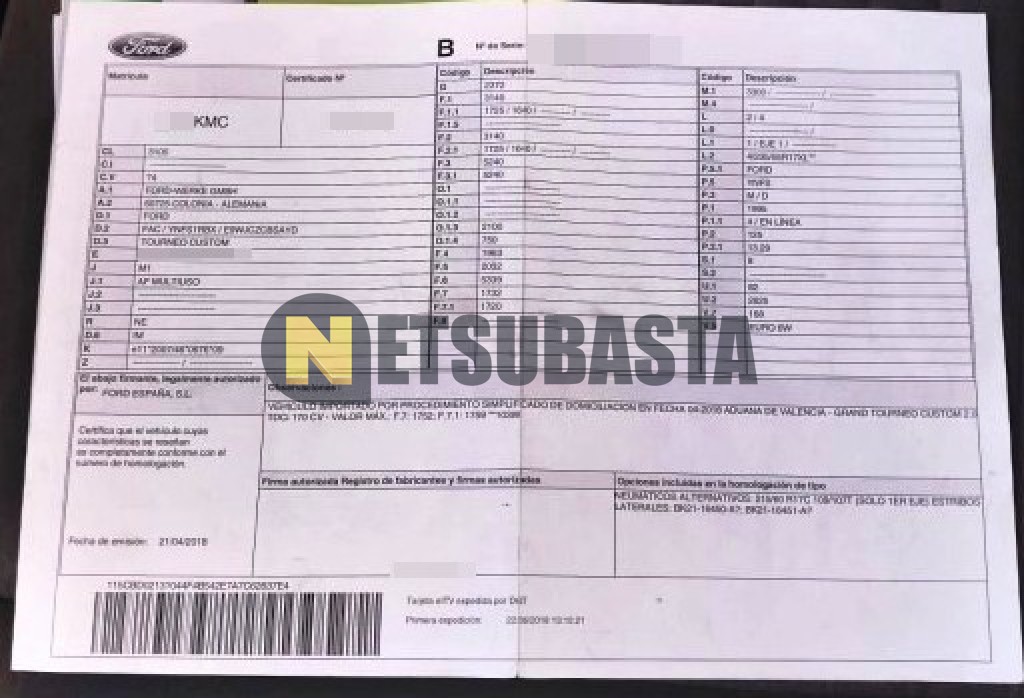 Subasta de Ford Tourneo Custom 2.0 TDCi 2018 Averiados, Marca Ford, Modelo Tourneo Custom 2.0 TDCi, Combustible Diésel, Kilometraje 125.000 KM, Fecha 1ª matriculación 06/2018, Matrícula ****KMC, Color Exterior , Color Interior , IVA REBU y Ubicación Barcelona.