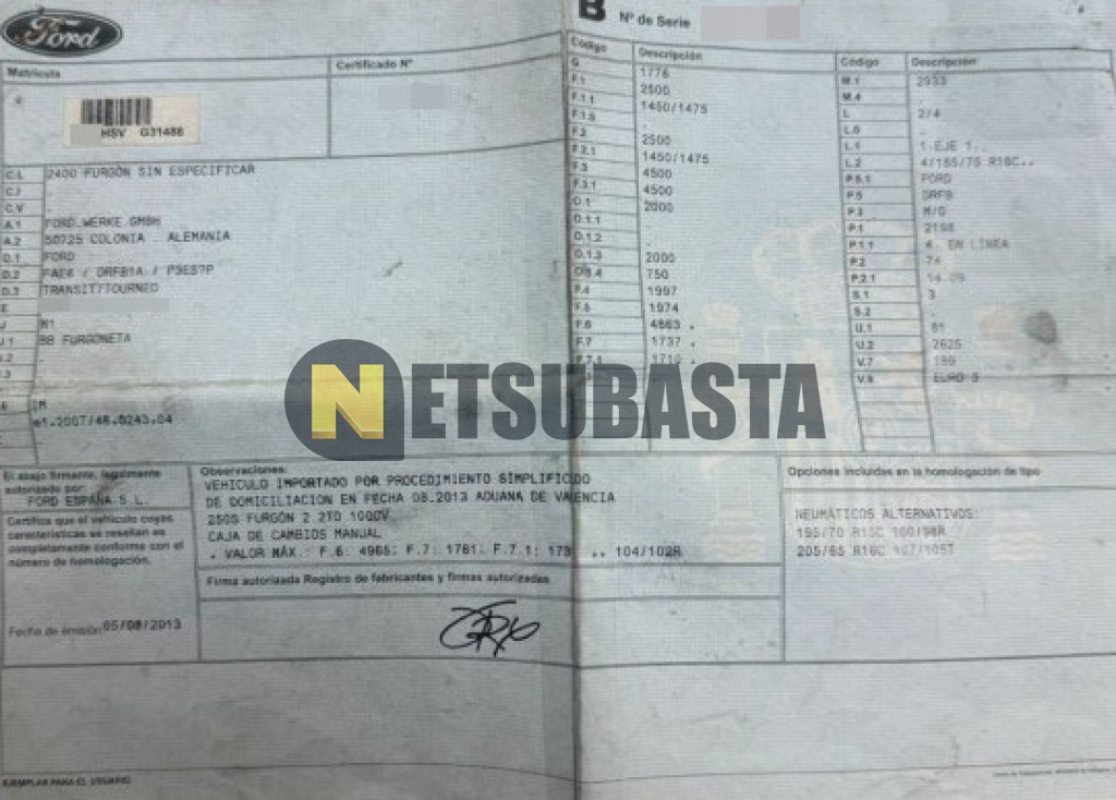 Subasta de Ford Transit 2.2 TDCi 2013 Averiados, Marca Ford, Modelo Transit 2.2 TDCi, Combustible Diésel, Kilometraje 300.000 KM, Fecha 1ª matriculación 09/2013, Matrícula ****HSV, Color Exterior , Color Interior , IVA REBU y Ubicación Madrid.