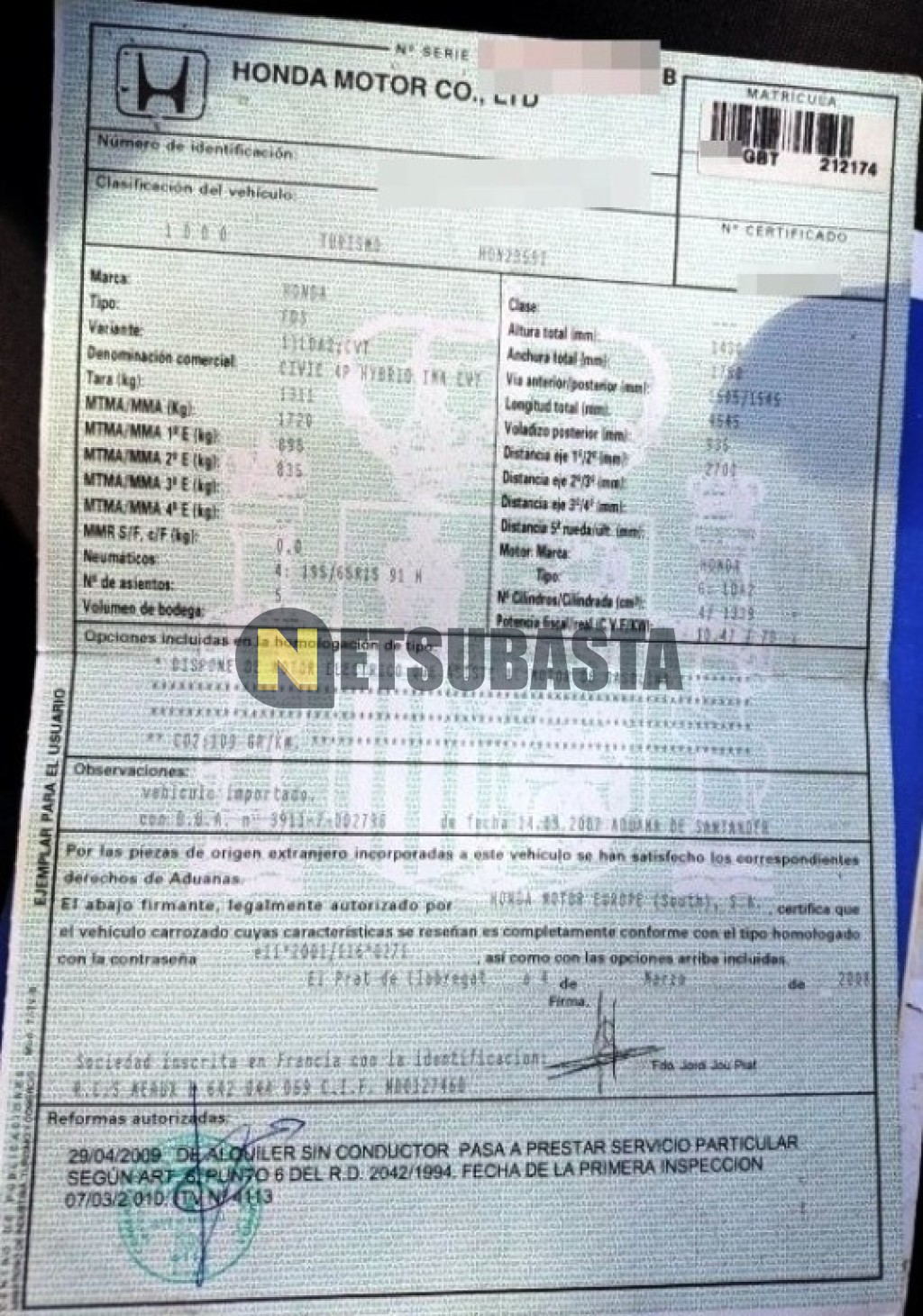 Subasta de Honda Civic Hybrid 2008 Averiados, Marca Honda, Modelo Civic Hybrid, Combustible Híbrido (Electro/Gasolina), Kilometraje 235.000 KM, Fecha 1ª matriculación 03/2008, Matrícula ****GBT, Color Exterior , Color Interior , IVA REBU y Ubicación Alicante.
