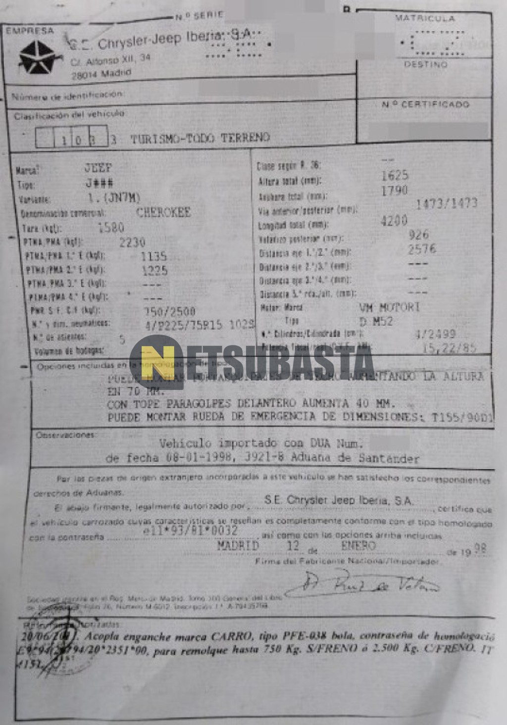 Subasta de Jeep Cherokee 2.5 TD 1998 Averiados, Marca Jeep, Modelo Cherokee 2.5 TD , Combustible Diésel, Kilometraje 255.000 KM, Fecha 1ª matriculación 03/1998, Matrícula SE****CZ, Color Exterior , Color Interior , IVA REBU y Ubicación Huelva.