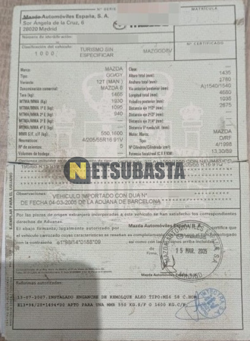 Subasta de Mazda 6 CRTD 2.0 16V 2005 Averiados, Marca Mazda, Modelo 6 CRTD 2.0 16V, Combustible Diésel, Kilometraje 416.000 KM, Fecha 1ª matriculación 06/2005, Matrícula ****DLJ, Color Exterior , Color Interior , IVA REBU y Ubicación La Coruña.