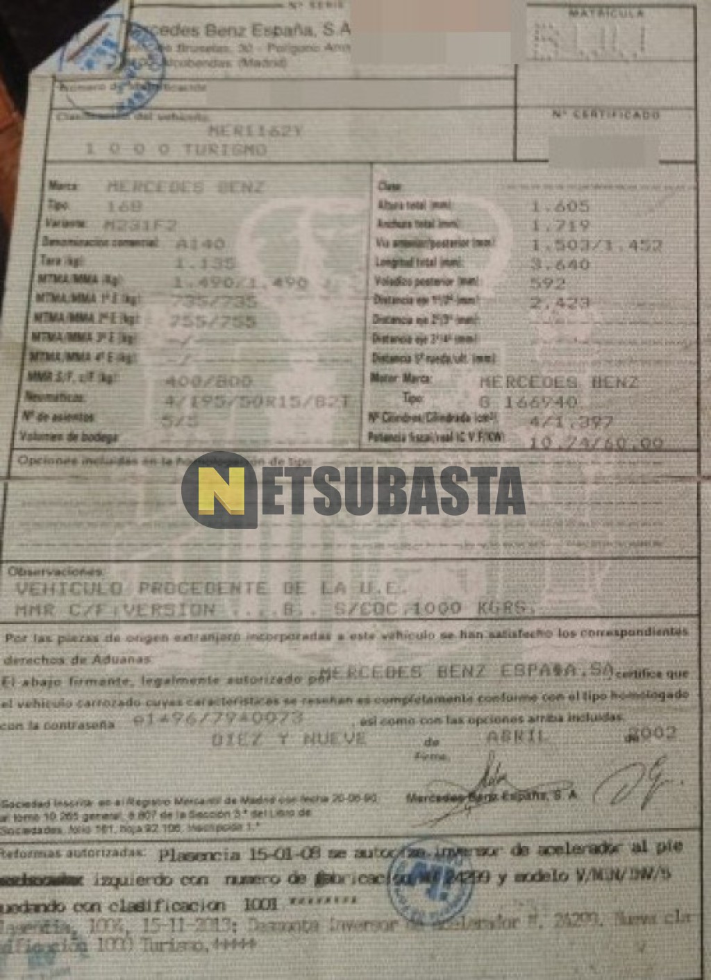 Subasta de Mercedes-Benz A 140 Aut. 2002 Averiados, Marca Mercedes-Benz, Modelo A 140 Aut., Combustible Gasolina, Kilometraje 160.000 KM, Fecha 1ª matriculación 04/2002, Matrícula ****BVV, Color Exterior , Color Interior , IVA REBU y Ubicación Madrid.