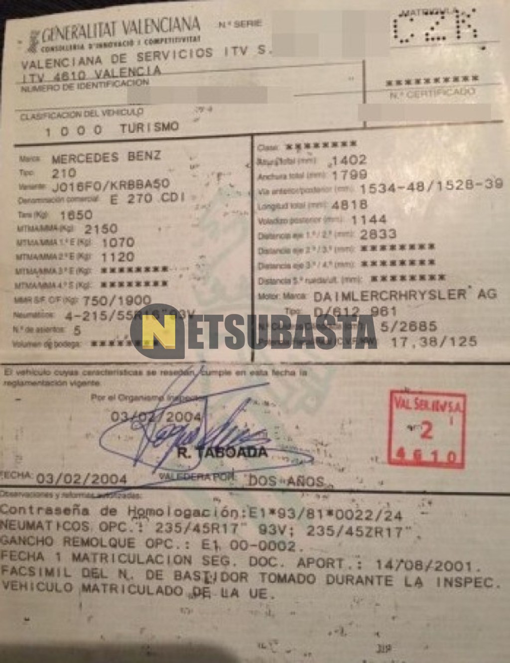 Subasta de Mercedes-Benz E 270 CDI 2001 Siniestrados, Marca Mercedes-Benz, Modelo E 270 CDI, Combustible Diésel, Kilometraje 425.000 KM, Fecha 1ª matriculación 08/2001, Matrícula ****CZK, Color Exterior , Color Interior , IVA REBU y Ubicación Valencia.