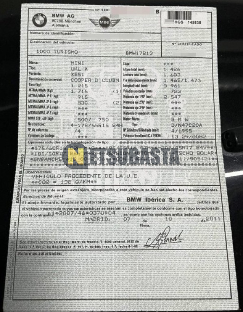 Subasta de Mini Clubman Cooper D Aut. 2011 Averiados, Marca Mini, Modelo Clubman Cooper D Aut., Combustible Diésel, Kilometraje 156.000 KM, Fecha 1ª matriculación 10/2011, Matrícula ****HGS, Color Exterior , Color Interior , IVA REBU y Ubicación Madrid.
