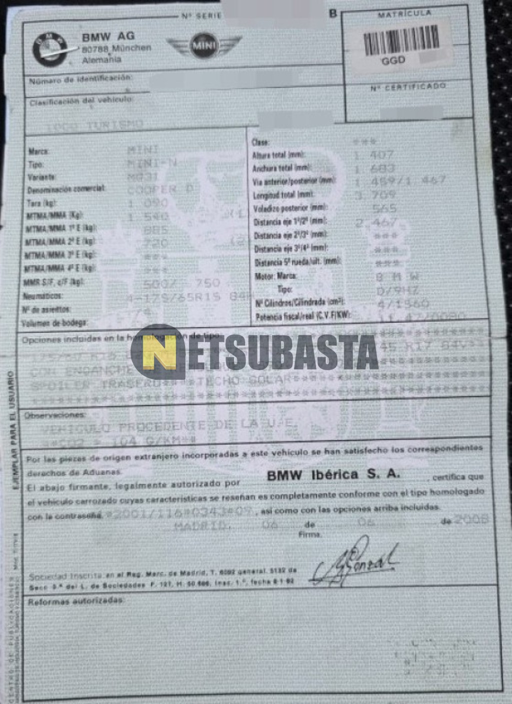 Subasta de Mini Cooper D 2008 Averiados, Marca Mini, Modelo Cooper D, Combustible Diésel, Kilometraje 240.000 KM, Fecha 1ª matriculación 07/2008, Matrícula ****GGD, Color Exterior , Color Interior , IVA REBU y Ubicación Tarragona.