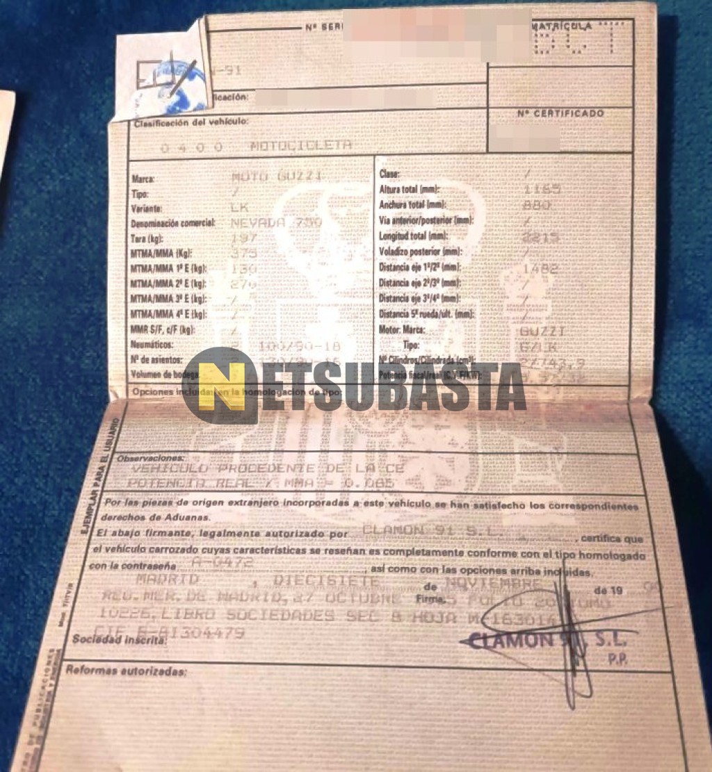 Subasta de Moto Guzzi Nevada 750 Club 2000 Averiados, Marca Moto Guzzi, Modelo Nevada 750 Club, Combustible Gasolina, Kilometraje 305.000 KM, Fecha 1ª matriculación 11/2000, Matrícula ****BCT, Color Exterior , Color Interior , IVA REBU y Ubicación Madrid.