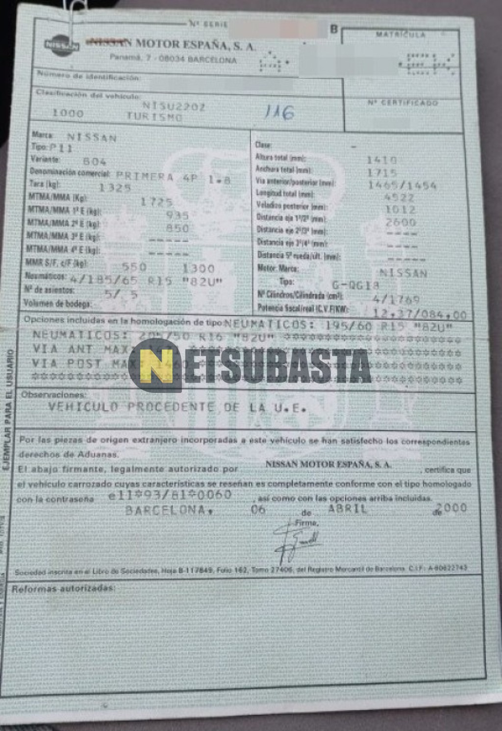 Recuerde que si lo desea, puede imprimir la ficha del vehículo Nissan Primera 1.8 2000 con todas sus características técnicas.