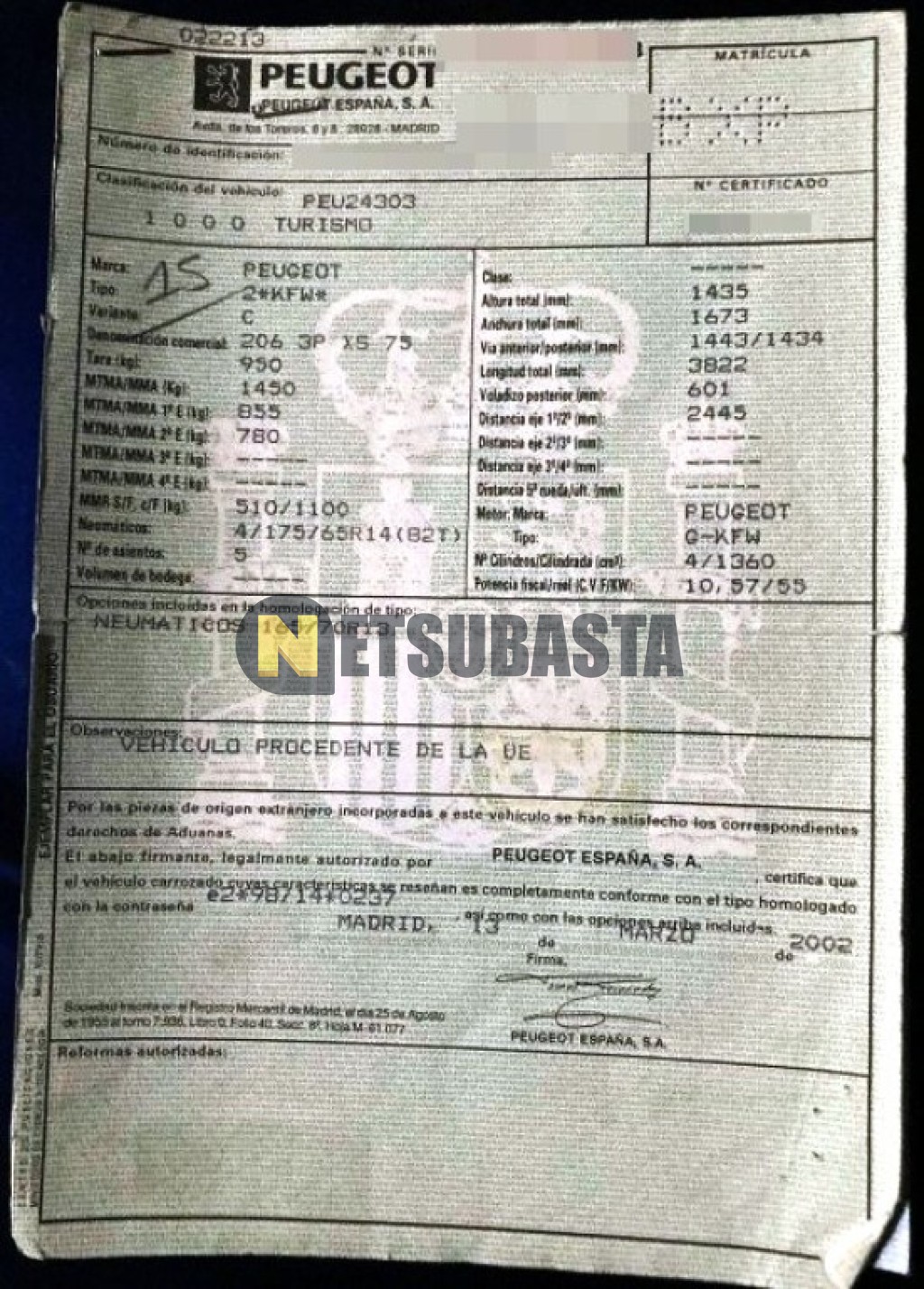 Subasta de Peugeot 206 1.4 2002 Averiados, Marca Peugeot, Modelo 206 1.4, Combustible Gasolina, Kilometraje 274.000 KM, Fecha 1ª matriculación 07/2002, Matrícula ****BXP, Color Exterior , Color Interior , IVA REBU y Ubicación Cantabria.