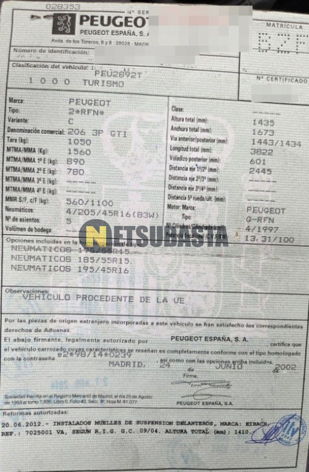 Subasta de Peugeot 206 2.0 2002 Averiados, Marca Peugeot, Modelo 206 2.0, Combustible Gasolina, Kilometraje 347.000 KM, Fecha 1ª matriculación 08/2002, Matrícula ****BZF, Color Exterior , Color Interior , IVA REBU y Ubicación Málaga.