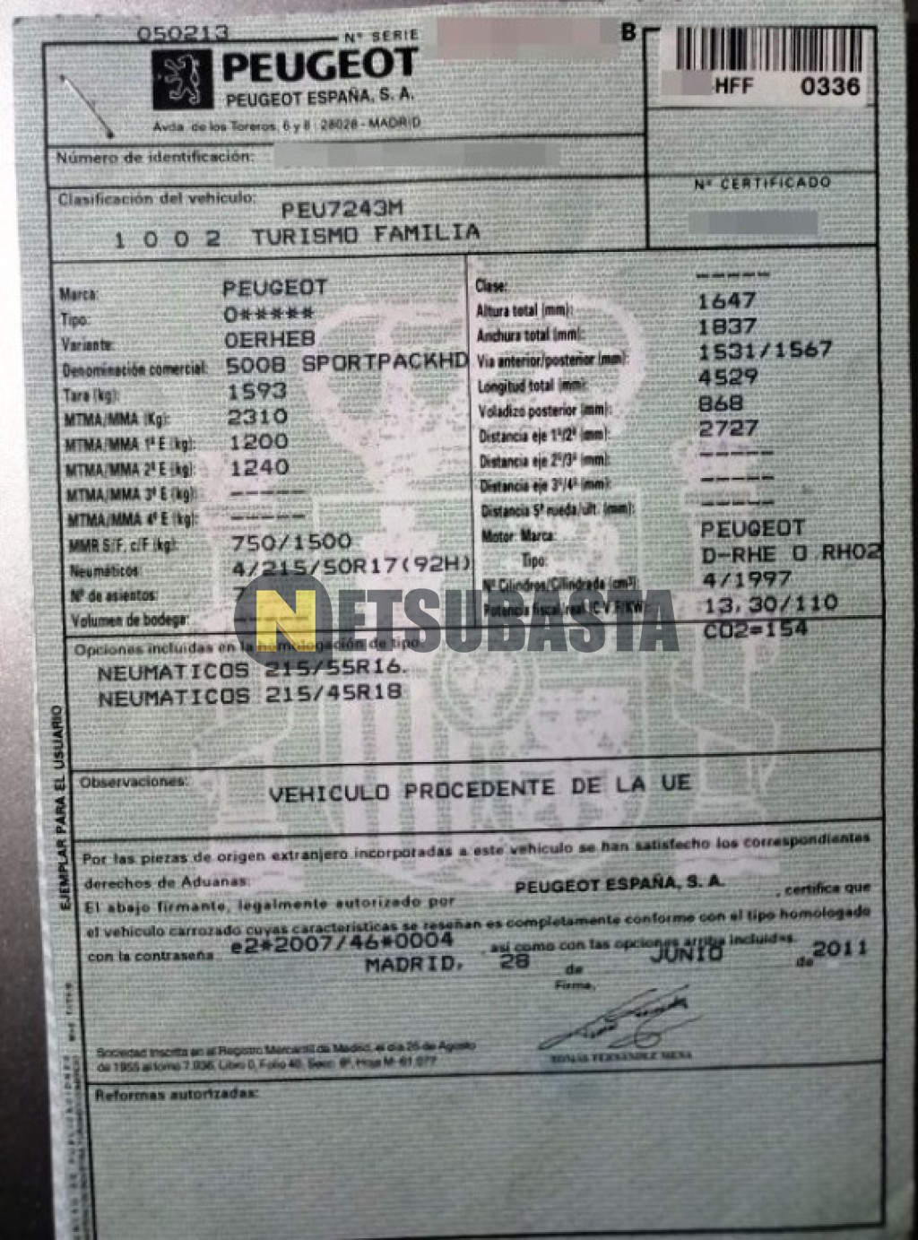 Subasta de Peugeot 5008 2.0 HDI 2011 Siniestrados, Marca Peugeot, Modelo 5008 2.0 HDI, Combustible Diésel, Kilometraje 135.000 KM, Fecha 1ª matriculación 06/2011, Matrícula ****HFF, Color Exterior , Color Interior , IVA REBU y Ubicación Teruel.
