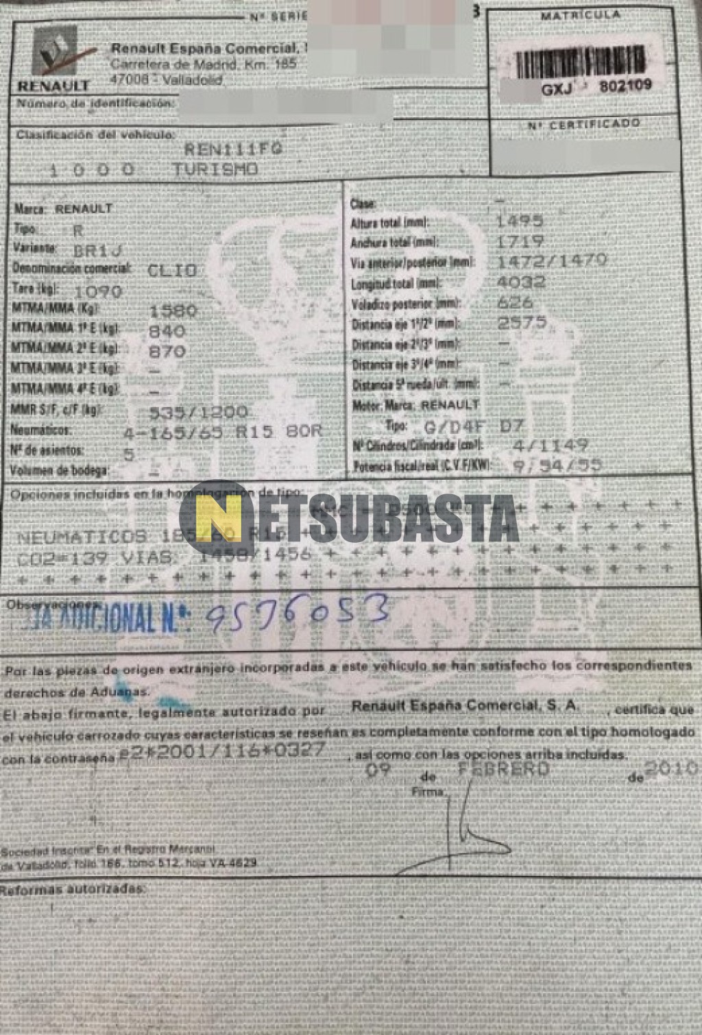 Subasta de Renault Clio 1.2 2010 Averiados, Marca Renault, Modelo Clio 1.2 , Combustible Gasolina, Kilometraje 110.000 KM, Fecha 1ª matriculación 06/2010, Matrícula ****GXJ, Color Exterior , Color Interior , IVA REBU y Ubicación Pontevedra.