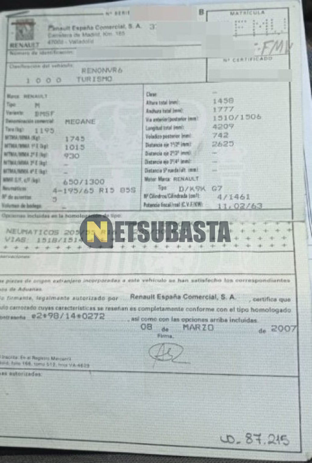 Subasta de Renault Megane 1.5 dCi 2007 Averiados, Marca Renault, Modelo Megane 1.5 dCi, Combustible Diésel, Kilometraje 480.000 KM, Fecha 1ª matriculación 03/2007, Matrícula ****FMV, Color Exterior , Color Interior , IVA REBU y Ubicación Las Palmas.