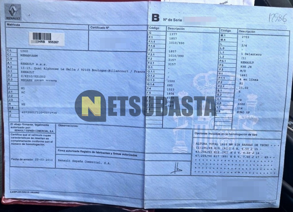 Subasta de Renault Megane Sport Tourer 1.5 dCi 2013 Averiados, Marca Renault, Modelo Megane Sport Tourer 1.5 dCi , Combustible Diésel, Kilometraje 245.000 KM, Fecha 1ª matriculación 05/2013, Matrícula ****HRB, Color Exterior , Color Interior , IVA REBU y Ubicación Barcelona.