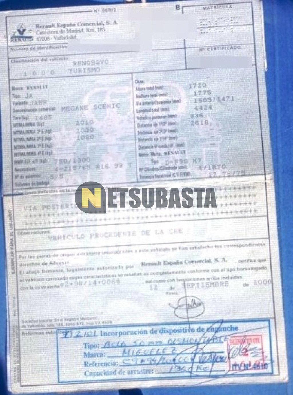 Subasta de Renault Scenic RX4 1.9 dCi 2000 Siniestrados, Marca Renault, Modelo Scenic RX4 1.9 dCi, Combustible Diésel, Kilometraje 280.000 KM, Fecha 1ª matriculación 10/2000, Matrícula ****BCF, Color Exterior , Color Interior , IVA REBU y Ubicación Albacete.