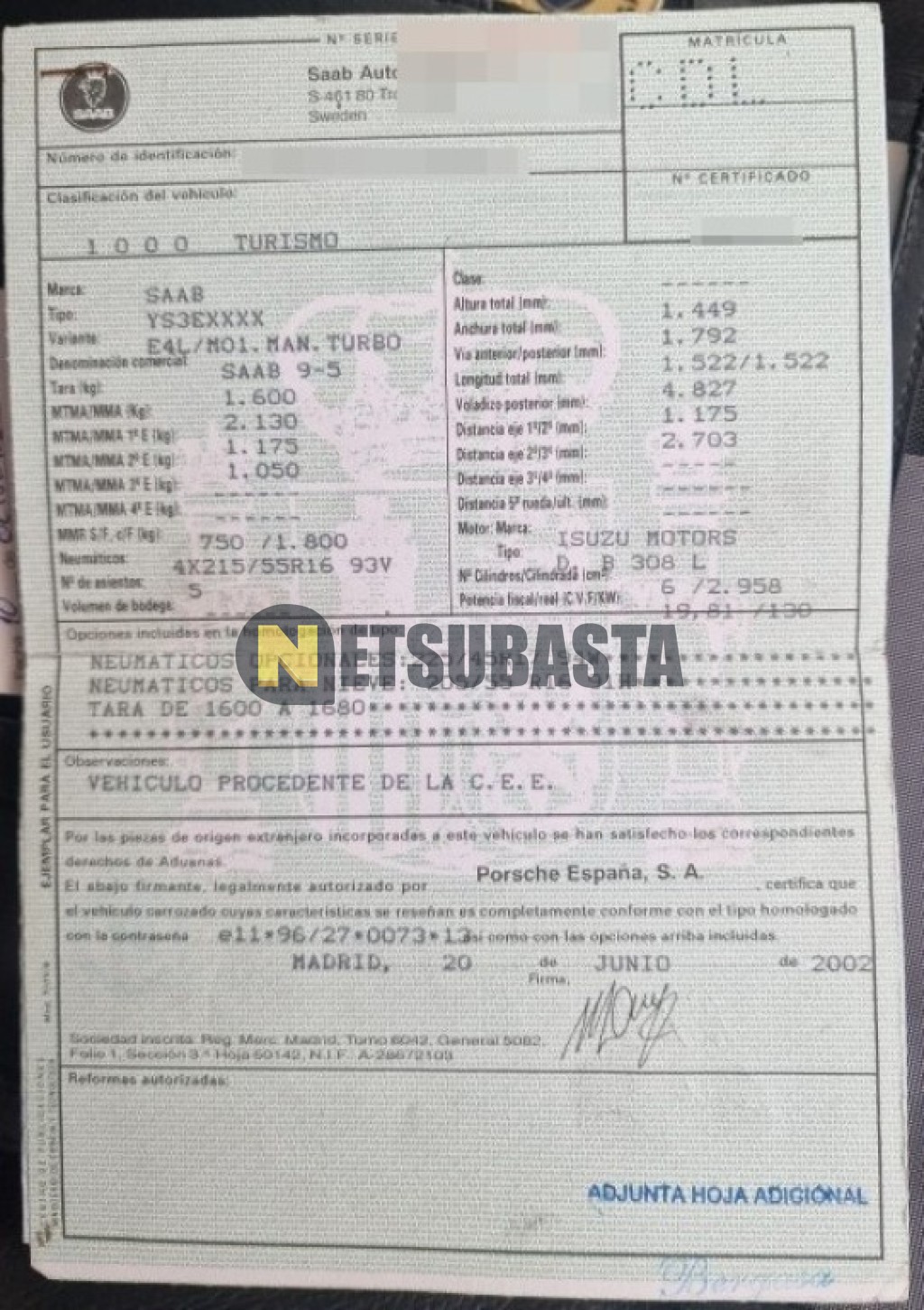 Subasta de Saab 9-5 Sedán 3.0 V6 TiD 2003 Averiados, Marca Saab, Modelo 9-5 Sedán 3.0 V6 TiD, Combustible Diésel, Kilometraje 178.000 KM, Fecha 1ª matriculación 01/2003, Matrícula ****CDL, Color Exterior , Color Interior , IVA REBU y Ubicación Navarra.