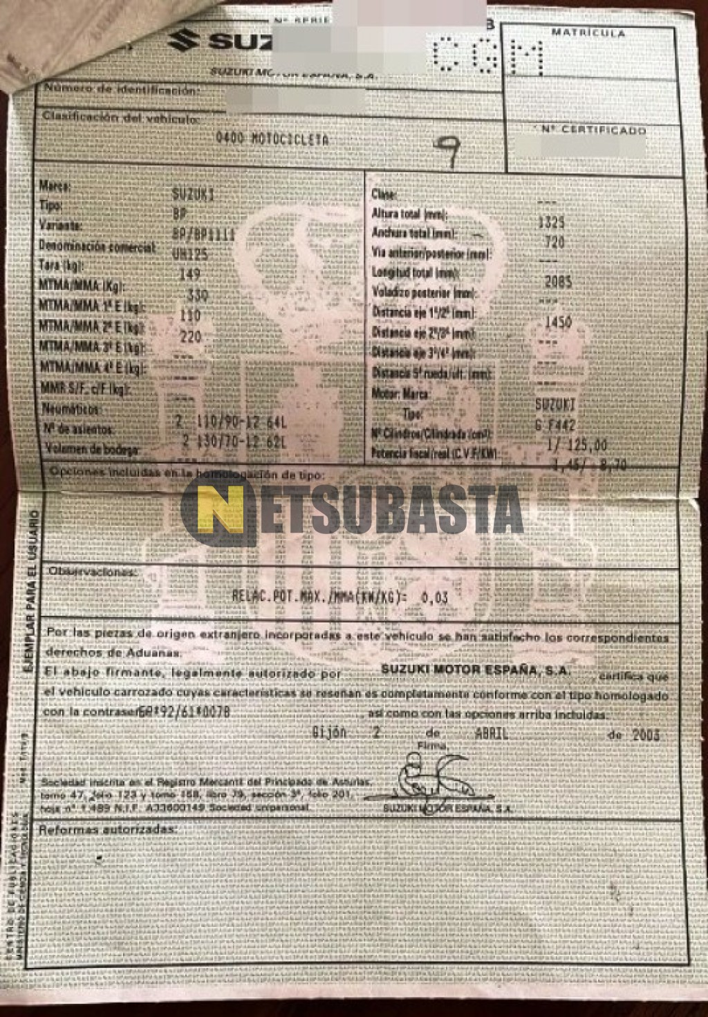 Subasta de Suzuki BURGMAN 125 2003 Averiados, Marca Suzuki, Modelo BURGMAN 125, Combustible Gasolina, Kilometraje 4.000 KM, Fecha 1ª matriculación 04/2003, Matrícula ****CGM, Color Exterior , Color Interior , IVA REBU y Ubicación Madrid.
