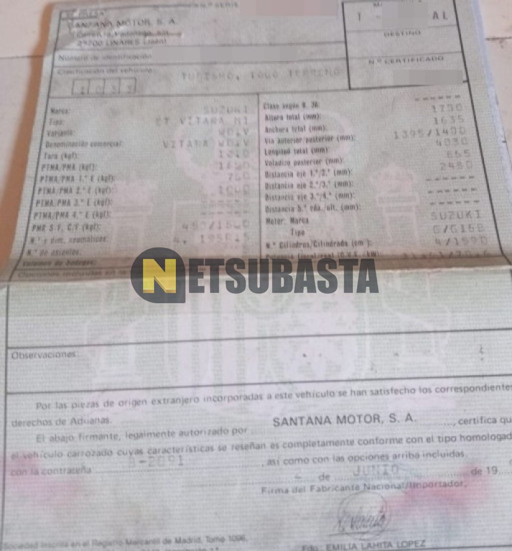 Subasta de Suzuki Vitara 1.6 1994 Averiados, Marca Suzuki, Modelo Vitara 1.6, Combustible Gasolina, Kilometraje 230.000 KM, Fecha 1ª matriculación 06/1994, Matrícula T****AL, Color Exterior , Color Interior , IVA REBU y Ubicación Tarragona.