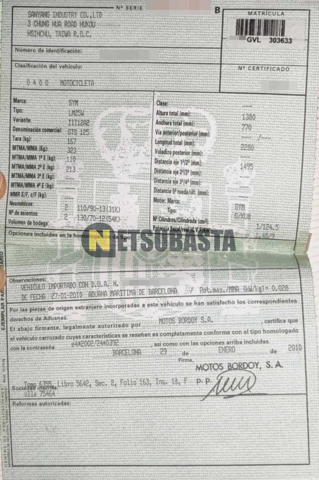 Subasta de SYM GTS 125 2010 Averiados, Marca SYM, Modelo GTS 125, Combustible Gasolina, Kilometraje 75.000 KM, Fecha 1ª matriculación 03/2010, Matrícula ****GVL, Color Exterior , Color Interior , IVA REBU y Ubicación Madrid.